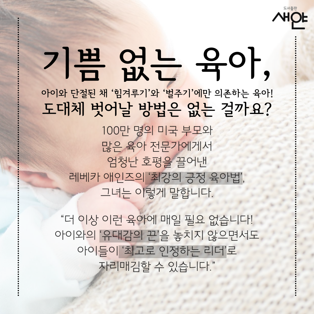 베스트셀러 작가로서 ‘긍정 육아법’을 히트시킨 레베카 애인즈의 『착한 엄마가 애들을 망친다고요?』. 이 책은 자녀와 지지고 볶는 촌극에 좌절감, 스트레스, 분노가 만연한 기존 육아에서 벗어나 육아에 진정한 기쁨을 느끼고 싶어 부모들을 위해, 소리 지르고, 잔소리하고, 누가 이기나 힘겨루는 육아 대신 유대감을 드높이는 ‘긍정 육아법’의 새로운 길을 제시한다.