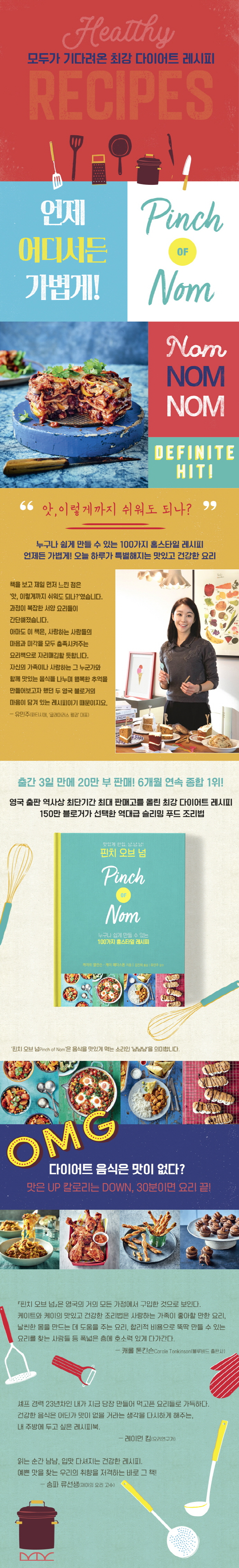 ‘핀치 오브 넘Pinch of Nom’은 음식을 맛있게 먹는 소리인 ‘냠냠냠’을 의미한다. 저자 케이트와 케이는 웹사이트 이름과 책 제목을 ‘핀치 오브 넘’이라고 지은 데 대해, 자신들이 만드는 음식은 다이어트 음식이 아닌 ‘진짜’ 음식이기 때문이라고 언급했다. 책 속에는 웹사이트에서 가장 인기 있는 22가지 역대급 요리와 더불어 80가지 최신 조리법이 담겨 있다. 책의 제목이 말해주듯이 여기 포함된 요리들은 물론 ‘핀치 오브 넘’에서 가장 대표적으로 손꼽히는 조리법을 활용했으며, 무엇보다 이 레시피들은 맛과 건강 두 가지 모두를 충족시키면서도 쉽고 간편하다. 구비해놓으면 편리한 필수 조리도구들과 최상의 다양한 맛을 느끼게 해주는 육수, 향신료 및 고칼로리 대체식품 등의 재료 소개도 눈여겨볼 만하다.